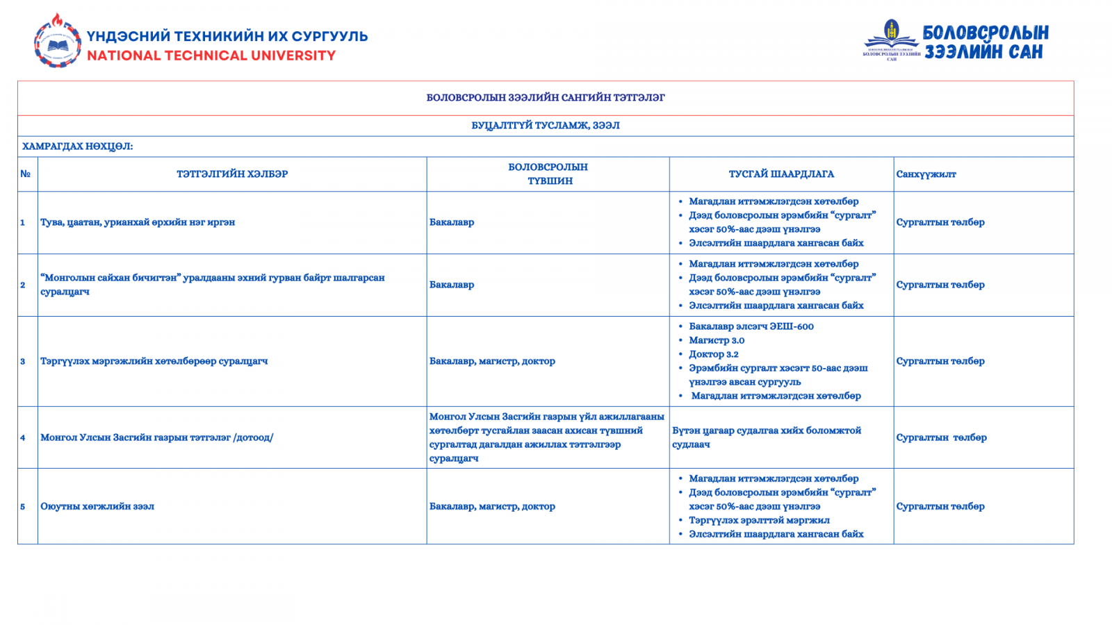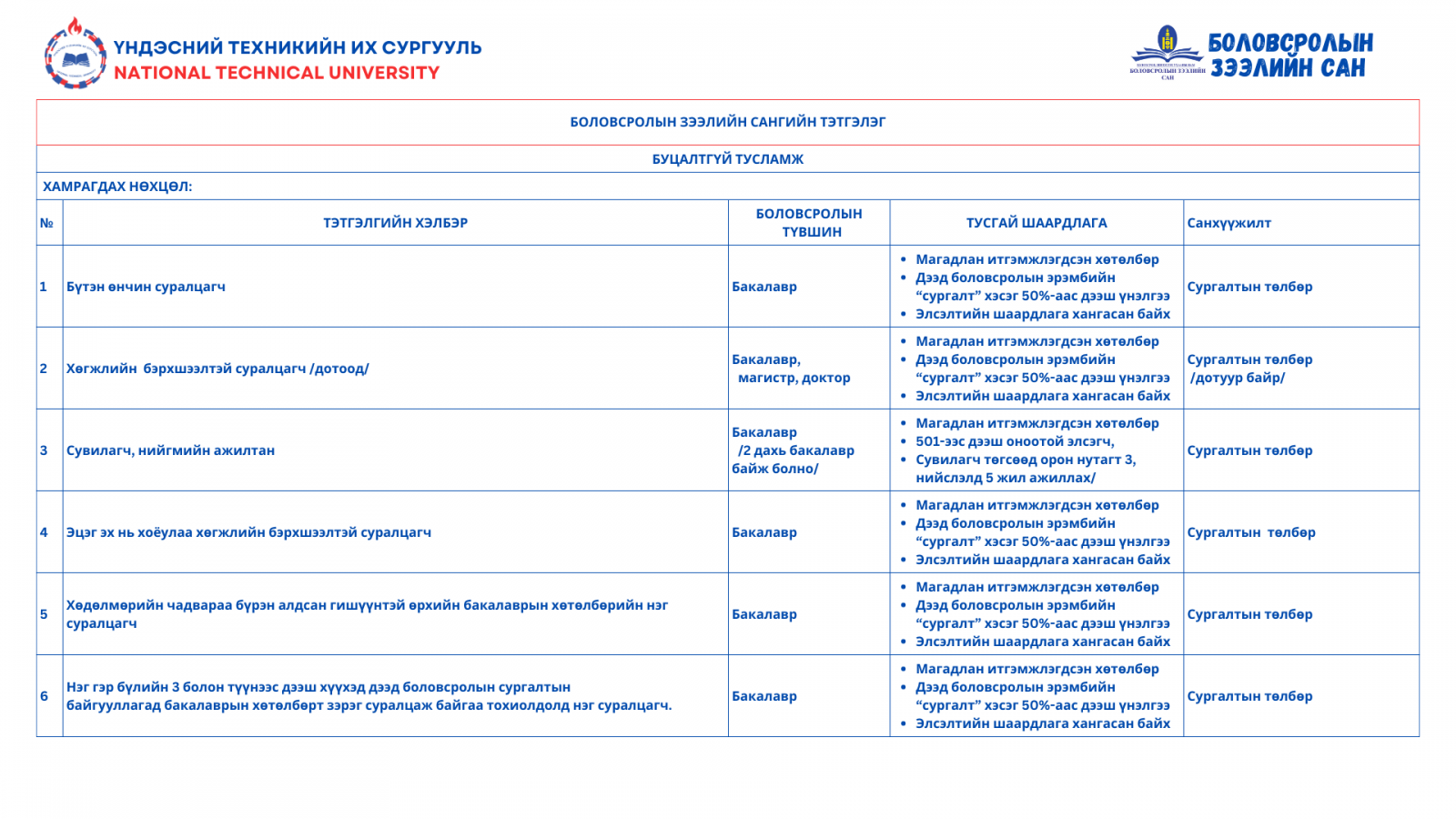 Боловсролын зээлийн сангийн тэтгэлэгт хамрагдах боломжтой.